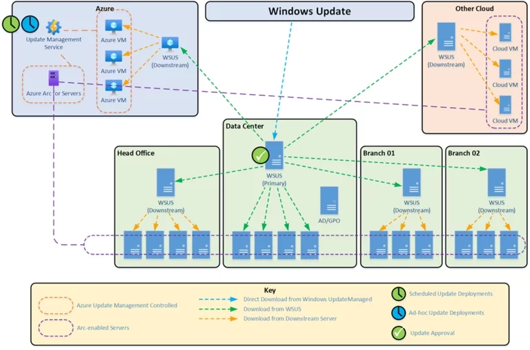 By combining WSUS and Azure Update Management, along with Azure Arc, you can benefit from both services for any device, regardless of its location or platform. For instance, you can use WSUS to approve and make available updates for your devices and use Azure Update Management to schedule and monitor the installation of those updates.